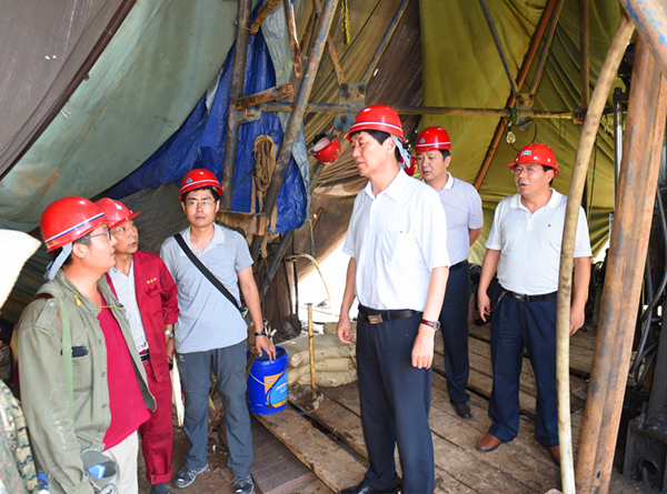 趙廷周一行來到早陽—茨溝金礦預查項目兩臺鉆機上,檢查施工現場安全生產情況,了解工作進度,詢問鉆工收入情況,叮囑大家千萬注意安全生產。