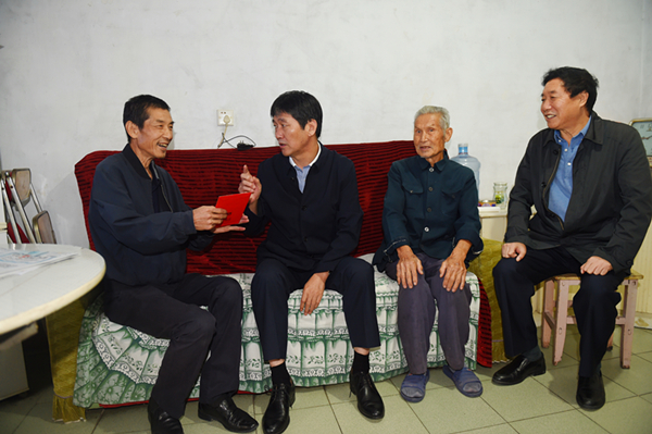 趙廷周一行首先來到物化探隊隊部,看望慰問了復(fù)轉(zhuǎn)軍人許朝陽同志和他的家人。他了解到許朝陽同志自1989年轉(zhuǎn)業(yè)到物化探隊工作至今,工作、生活穩(wěn)定,女兒已上大學(xué),由衷地感到欣慰。當(dāng)?shù)弥S朝陽同志年逾八旬的老父親也是位復(fù)轉(zhuǎn)軍人時,他高興地拉著老人的手噓寒問暖,好呀,我今天看望慰問你們兩代軍人、兩代地質(zhì)人。同時送上慰問金。